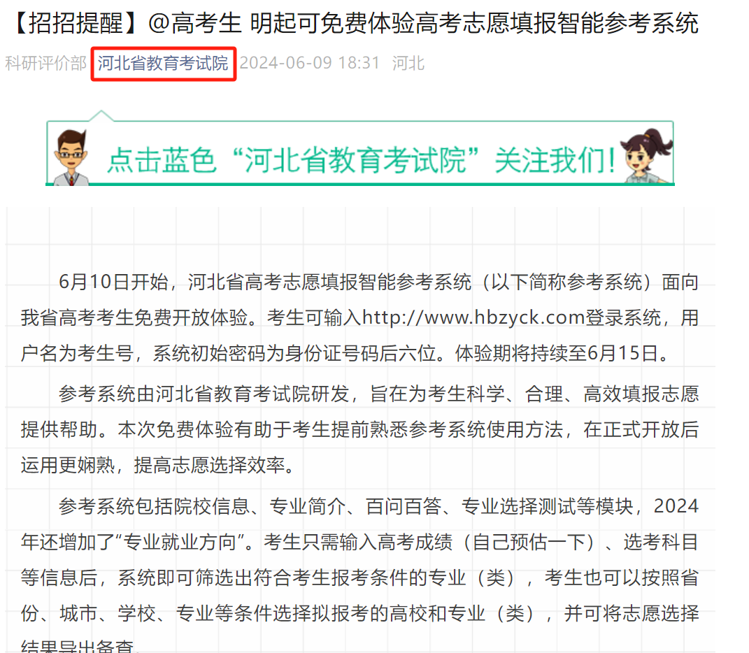 昨日,河北省教育考試院發(fā)布了關(guān)于6月10日起,高考生可免費(fèi)體驗(yàn)高考志愿填報(bào)智能參考系統(tǒng)的文章,各位考生們可以自行體驗(yàn)。