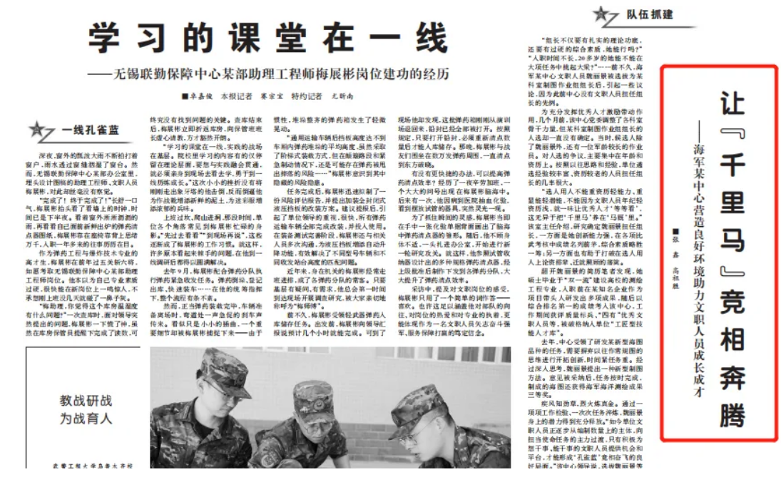 同年7月5日解放軍報發(fā)表的《讓“千里馬”競相奔騰》一文中提到海軍某中心文職人員魏某某被選拔為某科室組長后,打破了此前單位沒有文職人員擔任組長的先例。