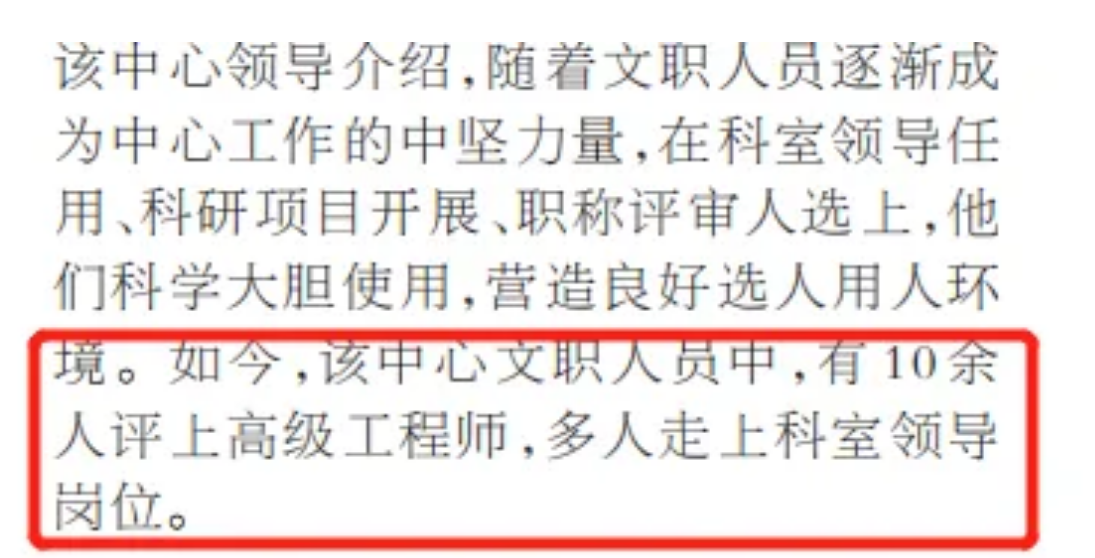 文章最后還提到“該中心文職人員中,有10多人評上了高級工程師,多人走上科室領導崗位”。