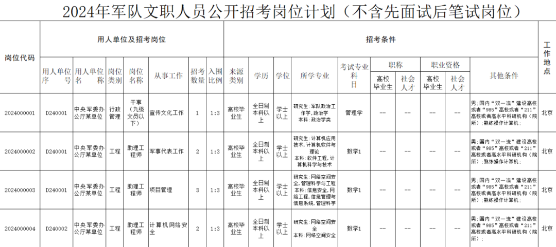 軍隊(duì)文職崗位表與公告一同在軍隊(duì)人才網(wǎng)發(fā)布。崗位表公布后,將其下載并用 xlsx 表格的篩選功能,依據(jù)自身的條件篩選出適宜的崗位。自身?xiàng)l件涵蓋性別、學(xué)歷、學(xué)位、政治面貌、所學(xué)專業(yè)等方面。