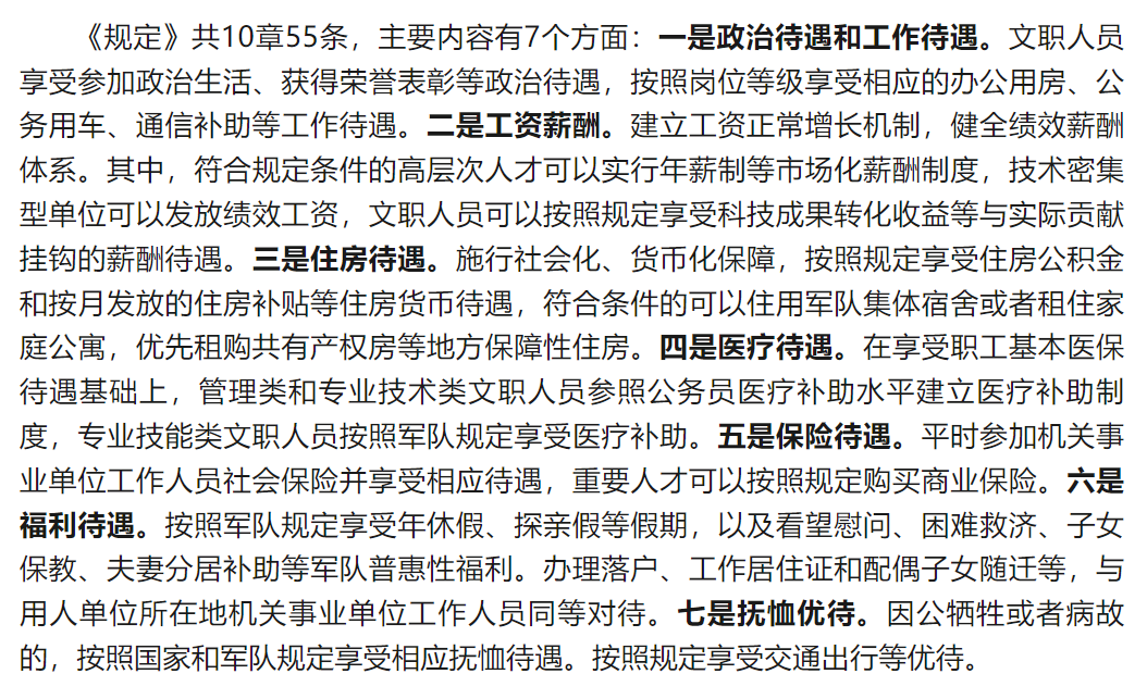 六險(xiǎn)二金十三薪、住房、醫(yī)療等多種補(bǔ)貼。中央軍委印發(fā)的《軍隊(duì)文職人員待遇保障暫行規(guī)定》,更是進(jìn)一步提高了軍隊(duì)文職人員的待遇保障,主要有以下七點(diǎn)內(nèi)容: