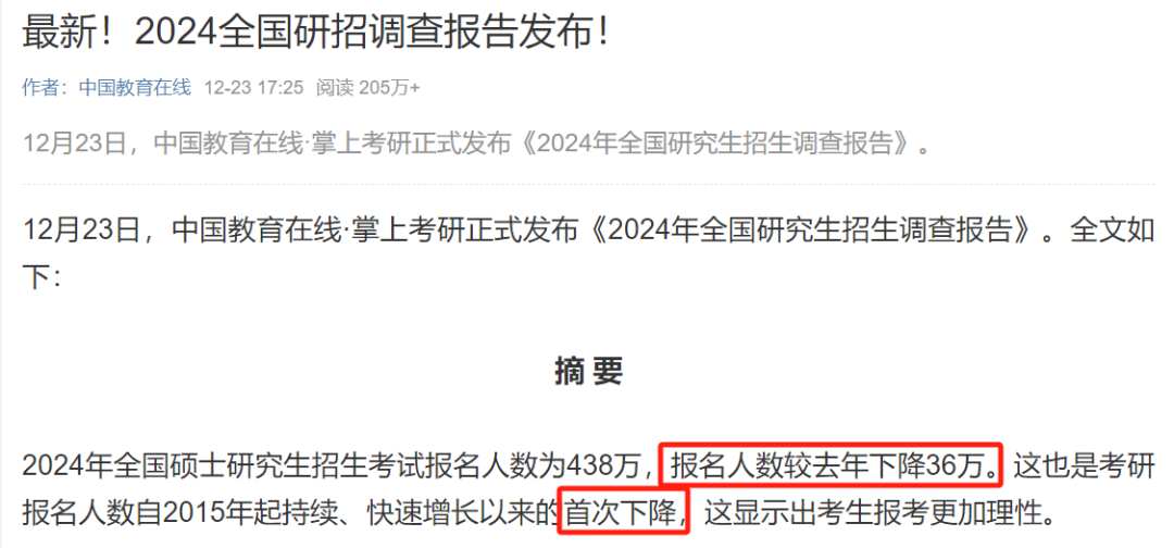 從2023年中國教育在線發(fā)布的《2024年全國研究生招生調(diào)查報告》中可知:今年的研究生報考人數(shù)相較去年呈現(xiàn)下降趨勢,減少了36萬,“考研熱”現(xiàn)象開始呈現(xiàn)降溫趨勢。