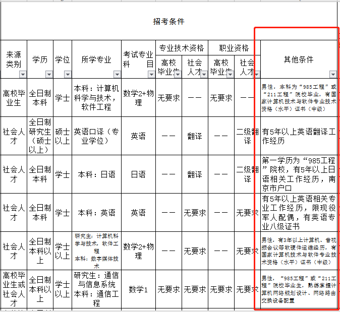 前幾種都是普遍性的要求,有的崗位還設(shè)置了一些其他條件,比如:性別、工作經(jīng)驗(yàn)、畢業(yè)院校為985或211、黨員等要求。