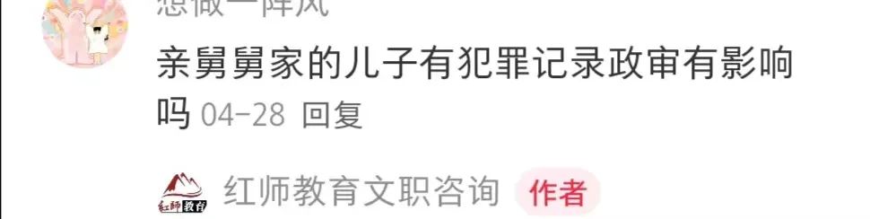 除了對政治條件有特殊要求的崗位以外,大部分崗位是不考察叔叔、舅舅、姨媽等旁系親屬的。但是如果考生的旁系親屬是監(jiān)護人或者直接撫養(yǎng)人,構(gòu)成了法律關(guān)系,那么這些人員就會被列入考核范圍。