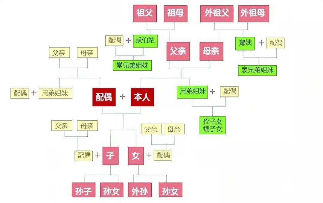 (粉色為直系血親;綠色代表三代以內(nèi)旁系血親;黃色代表近姻親關(guān)系。)
