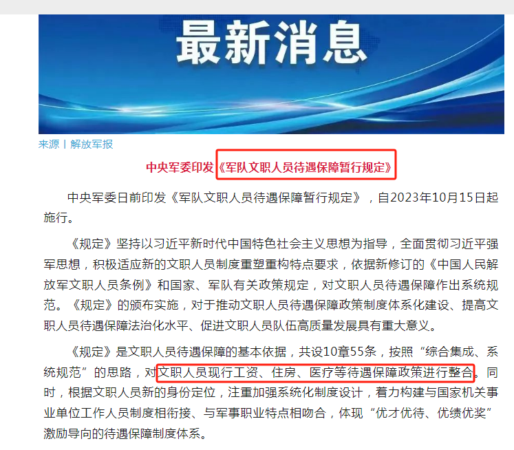 2023年10月8日,印發(fā)《軍隊(duì)文職人員待遇保障暫行規(guī)定》,自2023年10月15日起施行,這是一個(gè)非常利好的消息。也意味著軍隊(duì)文職待遇保障進(jìn)入了一個(gè)新篇章、新階段。對(duì)文職人員現(xiàn)行工資、住房、醫(yī)療等待遇保障政策進(jìn)行整合,進(jìn)一步清楚軍隊(duì)文職的職業(yè)是非常有發(fā)展、有保障的。相信隨著軍隊(duì)文職政策的不斷完善,各個(gè)方面會(huì)越來(lái)越好。