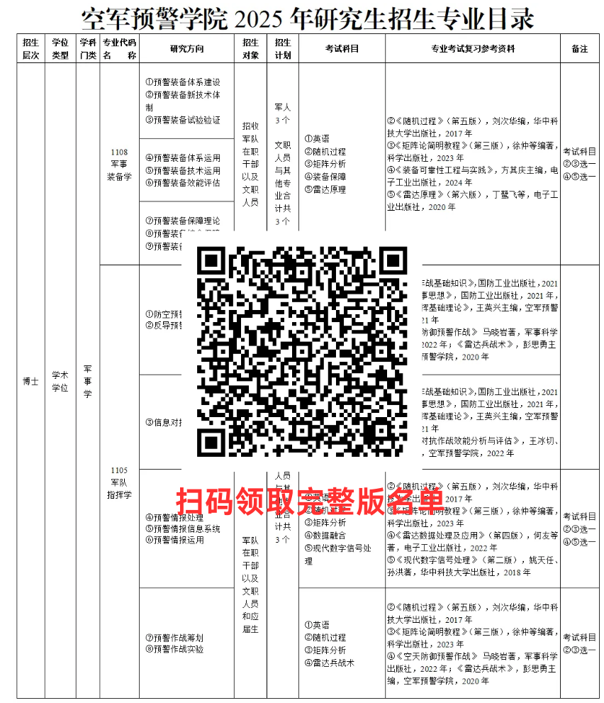 (四)軍隊院校直讀應(yīng)屆碩士畢業(yè)生報考我院博士研究生的,須在2025年1月前獲得碩士學(xué)歷學(xué)位證書,不得報考部分軍事學(xué)博士研究生(具體可報考專業(yè)詳見附表)。