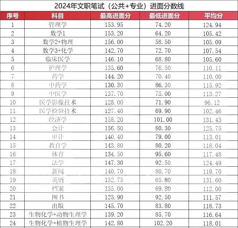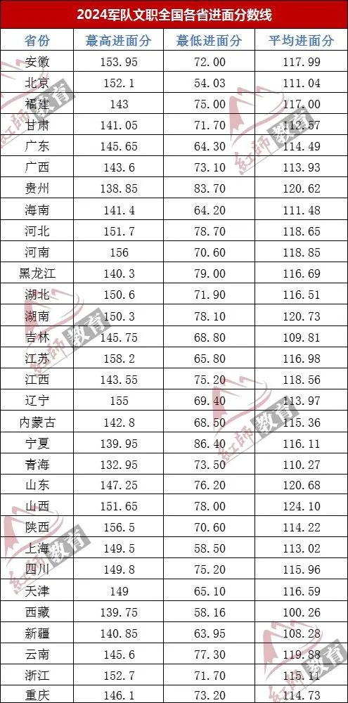 下圖是2024年軍隊(duì)文職全省進(jìn)面分?jǐn)?shù)線匯總,大家可以作為參考。