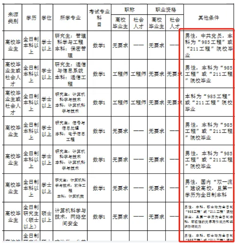 除了通行的學(xué)歷、專業(yè)、報(bào)考資格、考生來源等普遍性要求外,很多崗位還附加著“其他條件”,如性別、畢業(yè)院校為985或211、工作經(jīng)驗(yàn)、資格證書等。考生需要同時(shí)具備通行條件和附加條件,才有資格報(bào)考。
