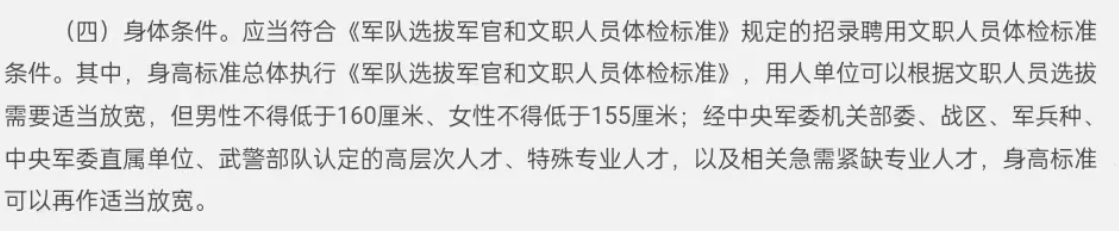 這里需要注意的是今年體檢標(biāo)準(zhǔn)不是完全按照女生身高最低158的標(biāo)準(zhǔn),允許單位根據(jù)需要放寬到155cm,特殊專業(yè)、緊缺專業(yè)、高層次人才還可以再度放寬。