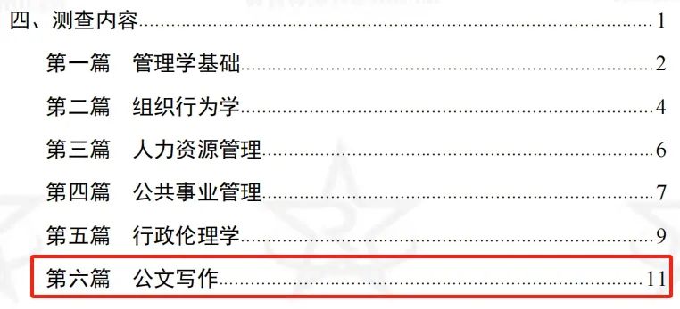 先來(lái)看一下管理學(xué)的考試大綱,管理學(xué)測(cè)查內(nèi)容分六篇,第六篇的“公文寫(xiě)作”就是主觀題。