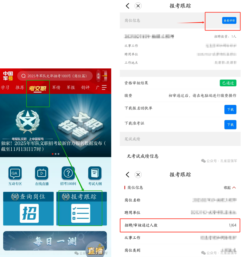 紅師教育給大家一個(gè)提醒:下載中國軍號(hào)APP,在【考文職】——【報(bào)考跟蹤】——【查看詳情】模塊可以看到自己所報(bào)崗位審核通過人數(shù)。