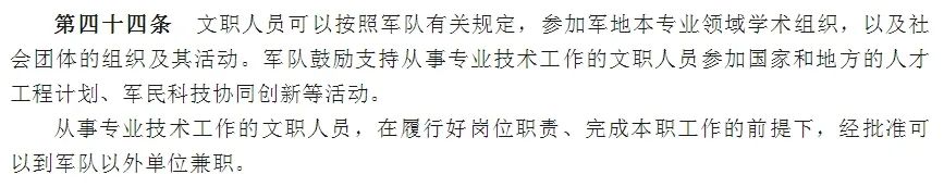 從《新條例》的規(guī)定來看是可以的,第四十四條:從事專業(yè)技術工作的文職人員,在履行好崗位職責、完成本職工作的前提下,經(jīng)批準可以到軍隊以外單位兼職。