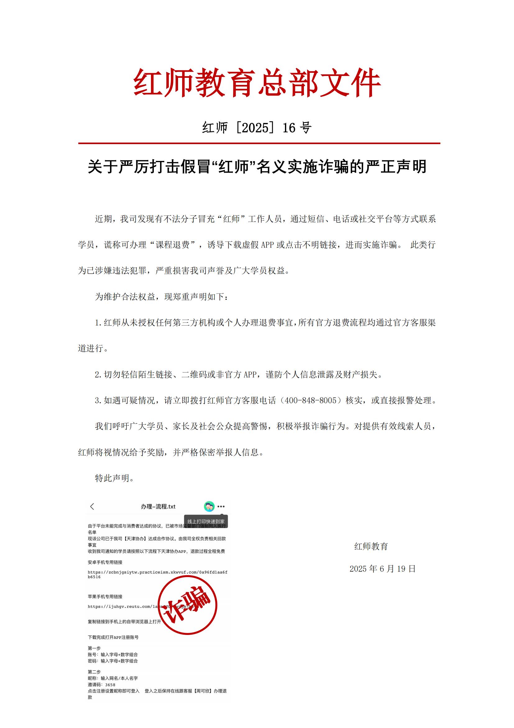 近期,我司發(fā)現(xiàn)有不法分子冒充“紅師”工作人員,通過短信、電話或社交平臺等方式聯(lián)系學員,謊稱可辦理“課程退費”,誘導下載虛假APP或點擊不明鏈接,進而實施詐騙。 此類行為已涉嫌違法犯罪,嚴重損害我司聲譽及廣大學員權(quán)益。
