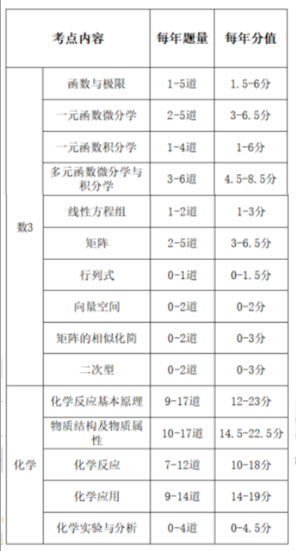 二、“數(shù)學(xué)3+化學(xué)”科目筆試內(nèi)容及題型1.考試內(nèi)容分析