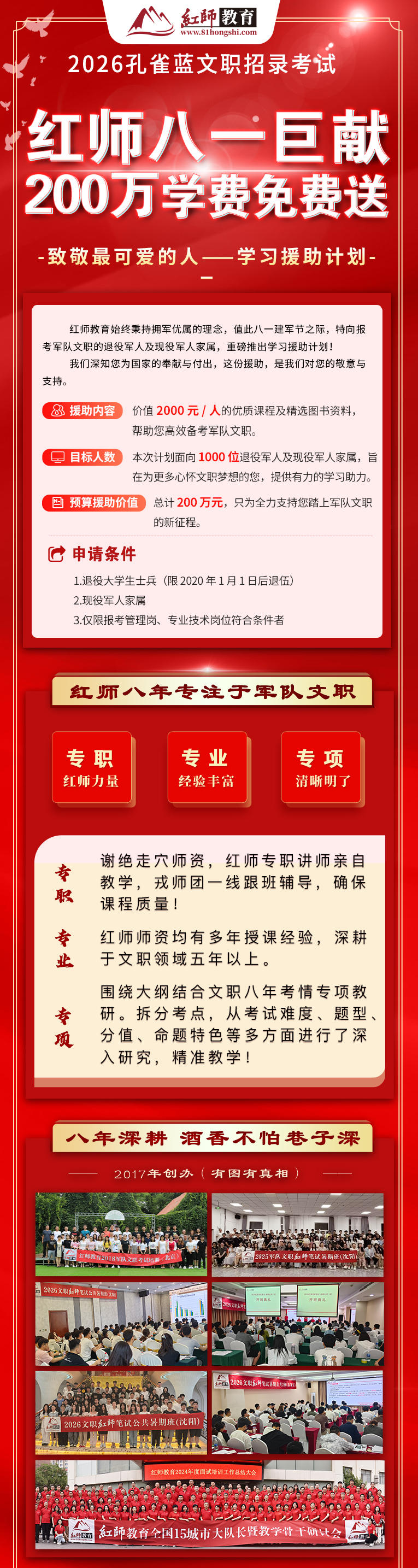 紅師教育始終秉持擁軍優(yōu)屬的理念,值此八一建軍節(jié)之際,特向報考軍隊文職的退役軍人及現(xiàn)役軍人家屬,重磅推出文職圓夢計劃!