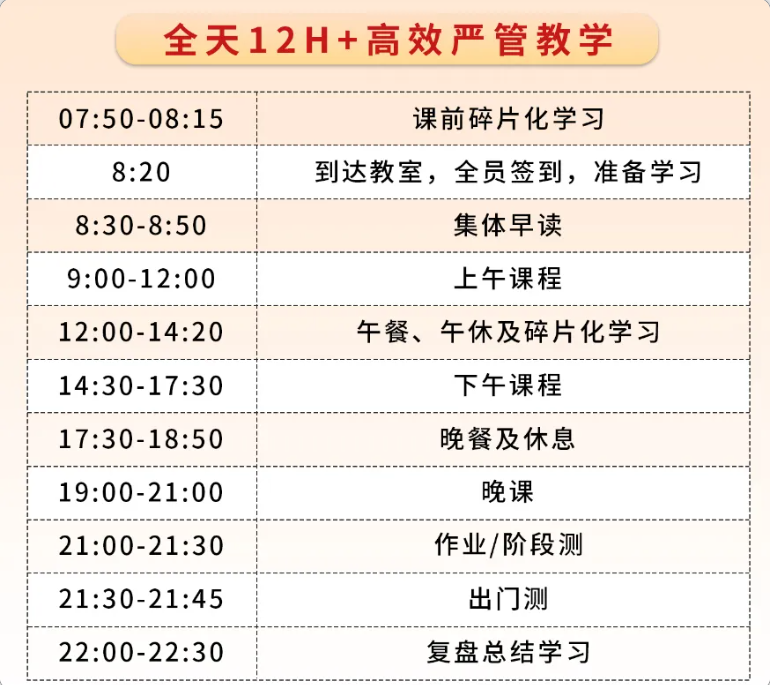 以“重回高三時(shí)光”為核心理念,構(gòu)建半封閉、高強(qiáng)度、精細(xì)化的備考體系,通過(guò)嚴(yán)格管理 +精準(zhǔn)教學(xué)+貼心服務(wù)三位一體模式,為考生打造沉浸式學(xué)習(xí)環(huán)境,助力實(shí)現(xiàn)成績(jī)突破與夢(mèng)想進(jìn)階。