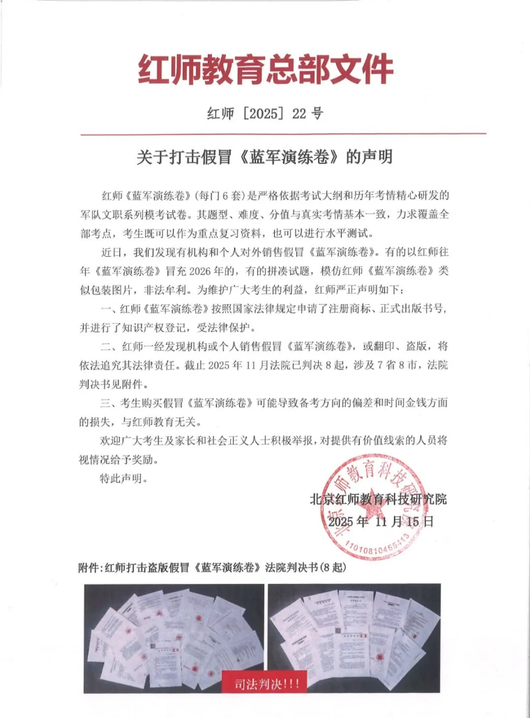 紅師教育堅決抵制盜版,一旦發(fā)現(xiàn)侵權(quán)將依法追責(zé)。呼吁小伙伴支持正版,既能享受完整服務(wù),也能讓我們更有動力打磨優(yōu)質(zhì)資料。選擇正版《藍(lán)軍演練卷》,就是選擇高效備考,離上岸更近一步。