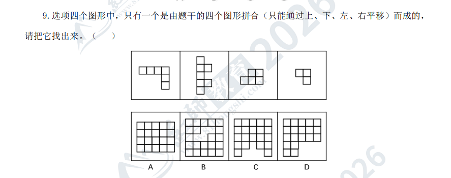 26-95.可由下列五個(gè)圖形只經(jīng)上、下、左、右平移而不經(jīng)旋轉(zhuǎn)、翻轉(zhuǎn)拼合而成的圖形是( )。