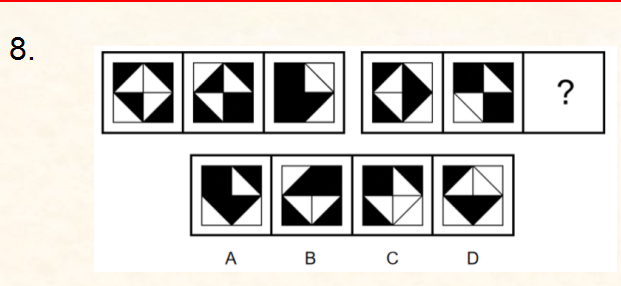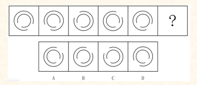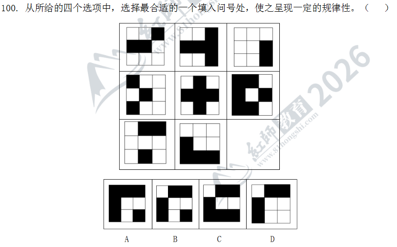 100.選擇一個(gè)圖形填入問(wèn)號(hào)處,使之呈現(xiàn)一定的規(guī)律性。最合適的是()