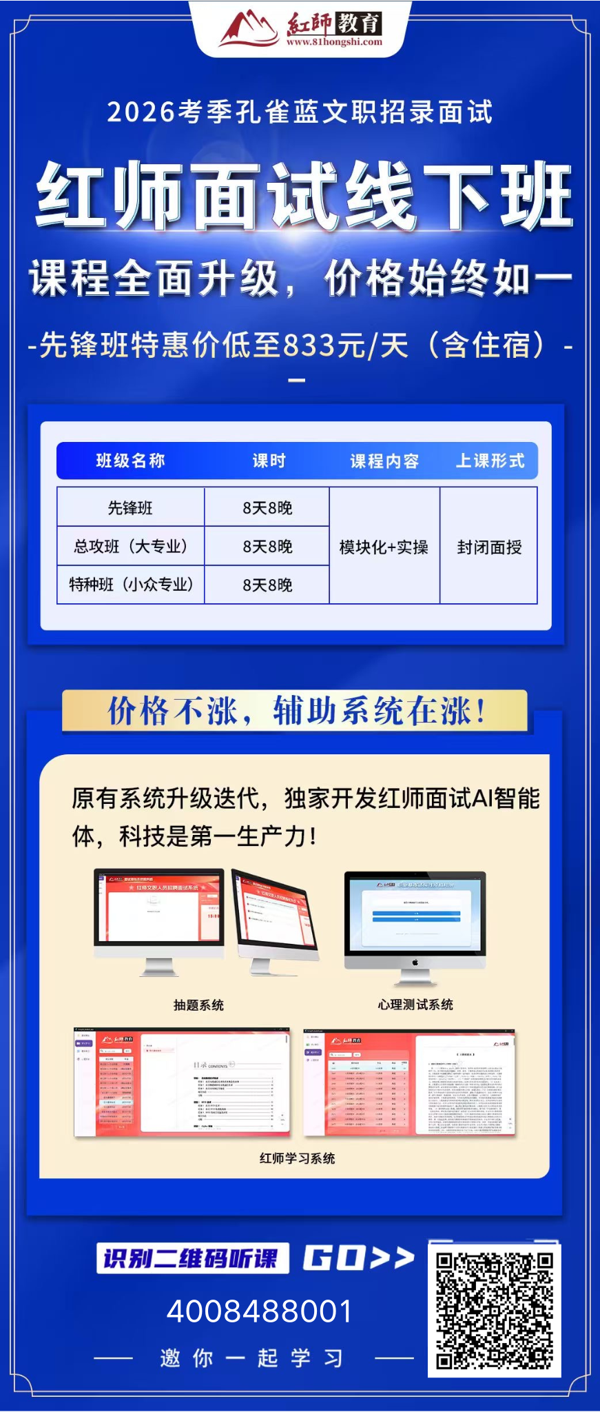 紅師的題庫對(duì)細(xì)分崗位的專業(yè)能力面試練習(xí)題下了大功夫。紅師教育把今年的崗位計(jì)劃表的崗位類別和從事工作,進(jìn)行了全面科學(xué)地梳理,紅師師資集中教研,整理出了400多種專業(yè)崗位,這400種細(xì)分專業(yè)崗位,覆蓋各大專業(yè)、輻射眾小專業(yè),細(xì)分崗位種類多。我們分別建立了題庫,這是任何同類培訓(xùn)機(jī)構(gòu)望塵莫及的。