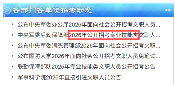 2026年1月4日8時06分軍隊人才網(wǎng)發(fā)布了中央軍委后勤保障部2026年技能崗的招考公告,此次共招考112個崗位,招錄419人。