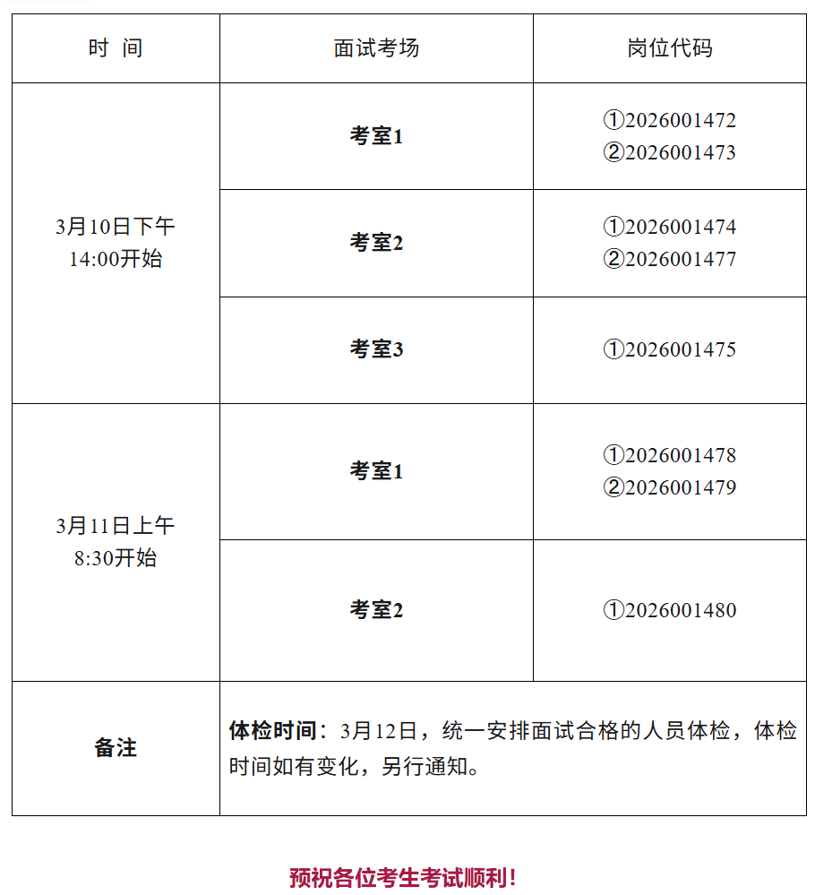 面試工作將于3月10日至3月11日集中組織,請對照《面試、體檢時間安排表》中崗位代碼和個人信息按時參加。面試開始時間:3月10日下午14時00分、3月11日上午08時30分,考生須提前1小時到達考場??忌竭_面試現(xiàn)場后進行身份驗證、抽簽排序、熟悉面試流程。未按時到達面試現(xiàn)場、影響面試進程的,經(jīng)考評組長、監(jiān)督人員確認后,取消考生面試資格,責任由考生自負。