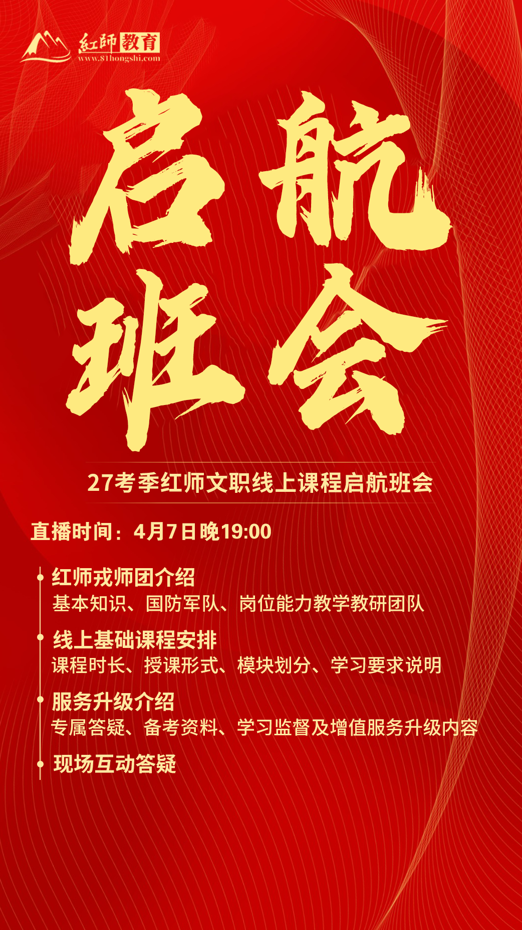 紅師教育 27 考季文職線上課程啟航班會,將于 4 月 7 日晚 19:00 正式開播。本次班會將全面介紹紅師戎師團(tuán)教研團(tuán)隊(duì)、線上基礎(chǔ)課程全體系安排,同步揭秘專屬答疑、備考資料、學(xué)習(xí)監(jiān)督等全新升級服務(wù),更設(shè)置現(xiàn)場互動答疑環(huán)節(jié),為 27 考季考生理清備考方向、解答備考疑問,助力大家高效備戰(zhàn)文職考試。