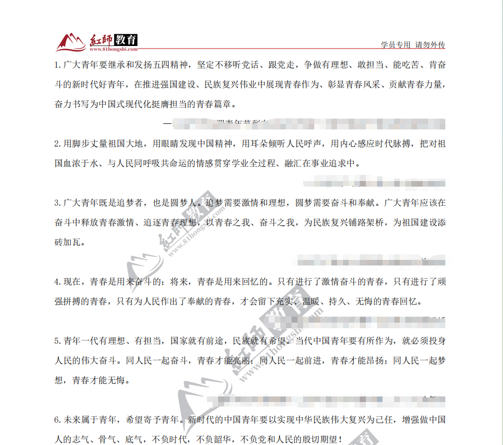 4.現(xiàn)在,青春是用來(lái)奮斗的;將來(lái),青春是用來(lái)回憶的。只有進(jìn)行了激情奮斗的青春,只有進(jìn)行了頑強(qiáng)拼搏的青春,只有為人民作出了奉獻(xiàn)的青春,才會(huì)留下充實(shí)、溫暖、持久、無(wú)悔的青春回憶。