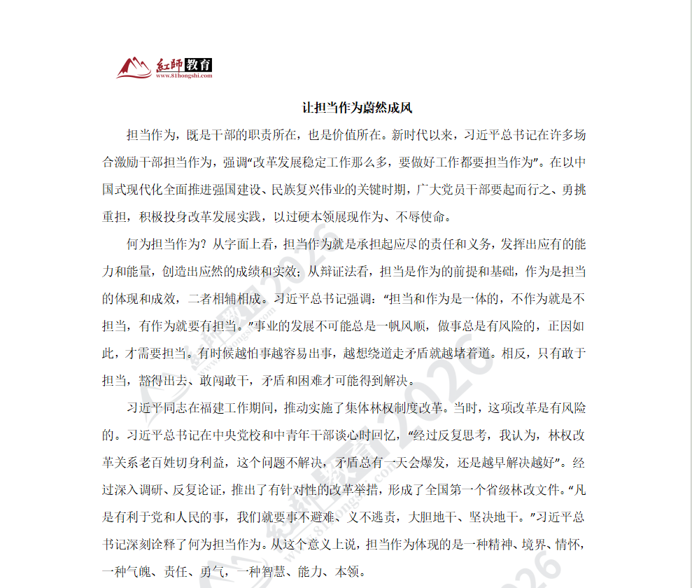 擔(dān)當(dāng)作為,既是干部的職責(zé)所在,也是價(jià)值所在。新時(shí)代以來,習(xí)近平總書記在許多場(chǎng)合激勵(lì)干部擔(dān)當(dāng)作為,強(qiáng)調(diào)"改革發(fā)展穩(wěn)定工作那么多,要做好工作都要擔(dān)當(dāng)作為"。在以中國(guó)式現(xiàn)代化全面推進(jìn)強(qiáng)國(guó)建設(shè)、民族復(fù)興偉業(yè)的關(guān)鍵時(shí)期,廣大黨員干部要起而行之、勇挑重?fù)?dān),積極投身改革發(fā)展實(shí)踐,以過硬本領(lǐng)展現(xiàn)作為、不辱使命。