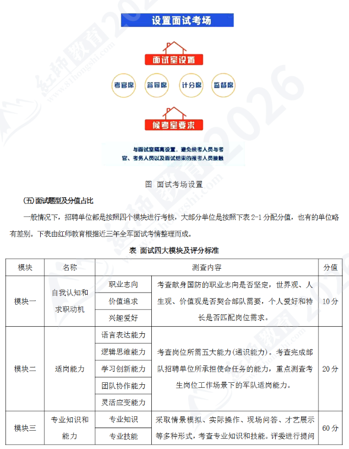 在軍隊(duì)文職面試工作中,招聘單位特別注重考生的實(shí)際工作能力,通常會(huì)將情景模擬和實(shí)際操作考核作為面試考核的重點(diǎn)(見(jiàn)圖)。比如,管理崗位注重考核考生的靈活應(yīng)變能力;專(zhuān)業(yè)技術(shù)崗位重點(diǎn)考核試講、說(shuō)課;醫(yī)護(hù)類(lèi)崗位重點(diǎn)考核護(hù)理操 作;文體類(lèi)崗位重點(diǎn)考核才藝展示等。