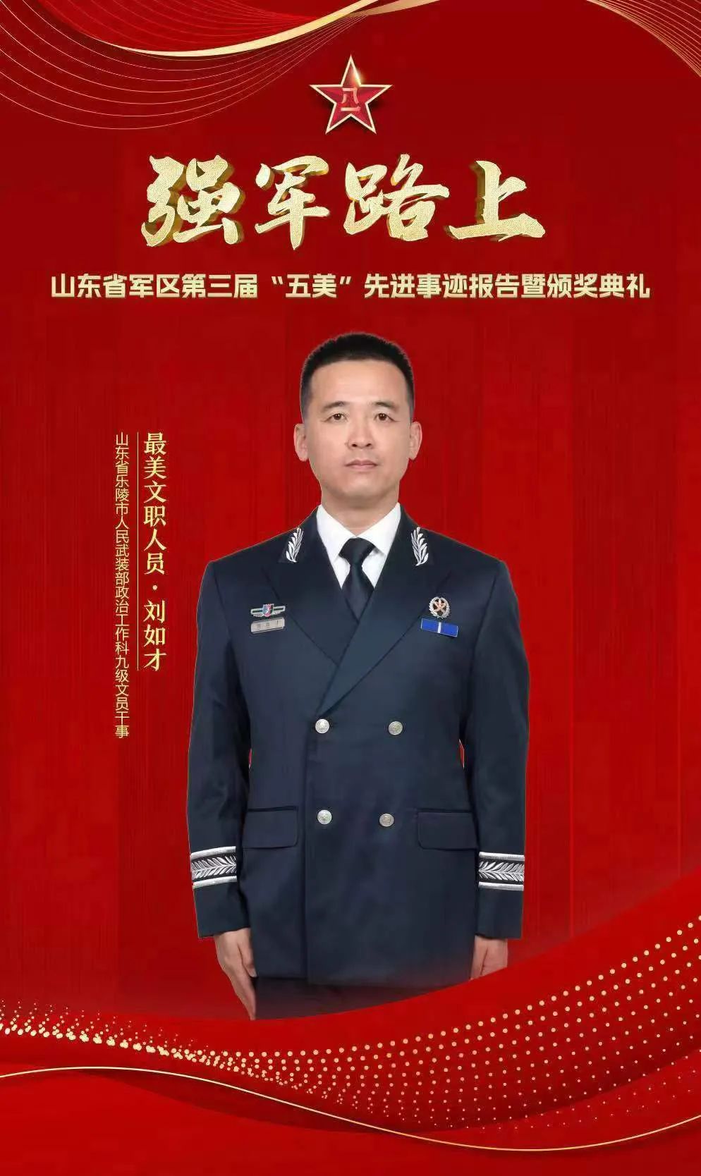 個人簡介:劉如才,男,1986年3月生,2005年9月入伍,2007年12月入黨,2018年11月轉(zhuǎn)業(yè),2019年通過社會招考成為軍隊文職人員,現(xiàn)為樂陵市人武部政治工作科九級文員干事。被德州軍分區(qū)評為“動員工作先進個人”,2次被評為“人武部建設(shè)先進個人”。