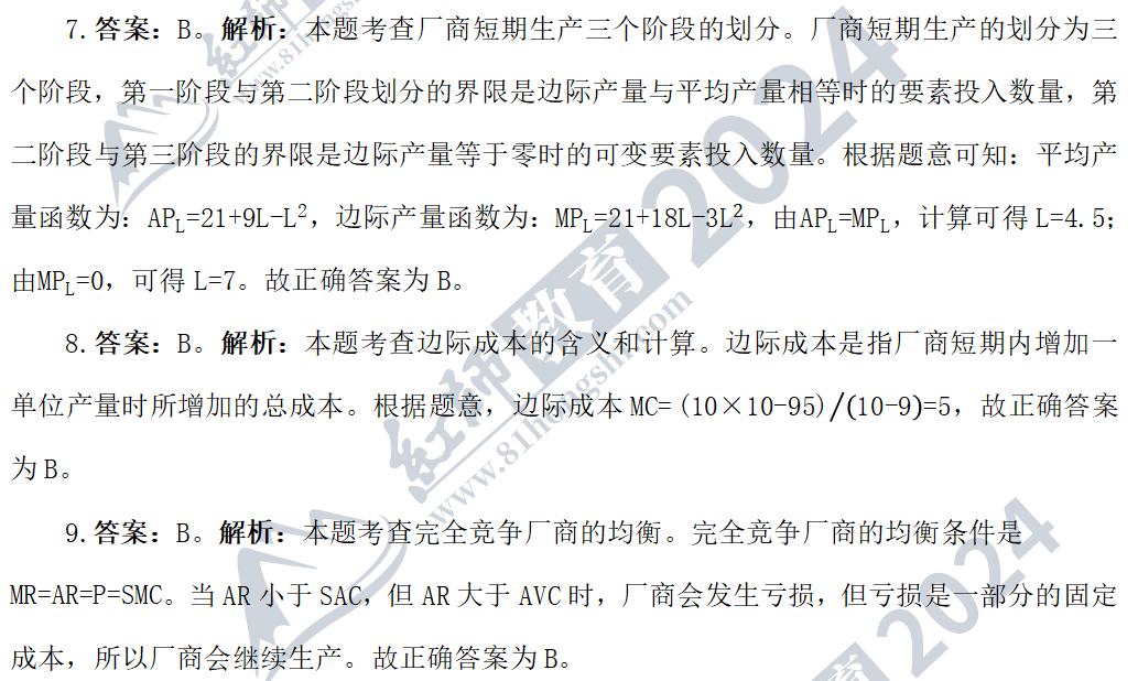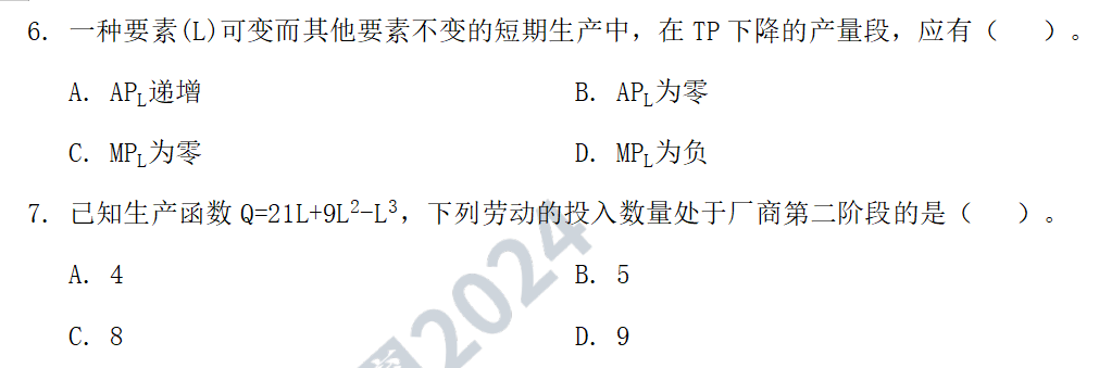 6.答案:D。解析:本題考查短期產量函數(shù)之間的關系。當總產量下降時,平均產量遞減,但是為正值,邊際產量遞減,為負值。綜上所述,正確答案為D。