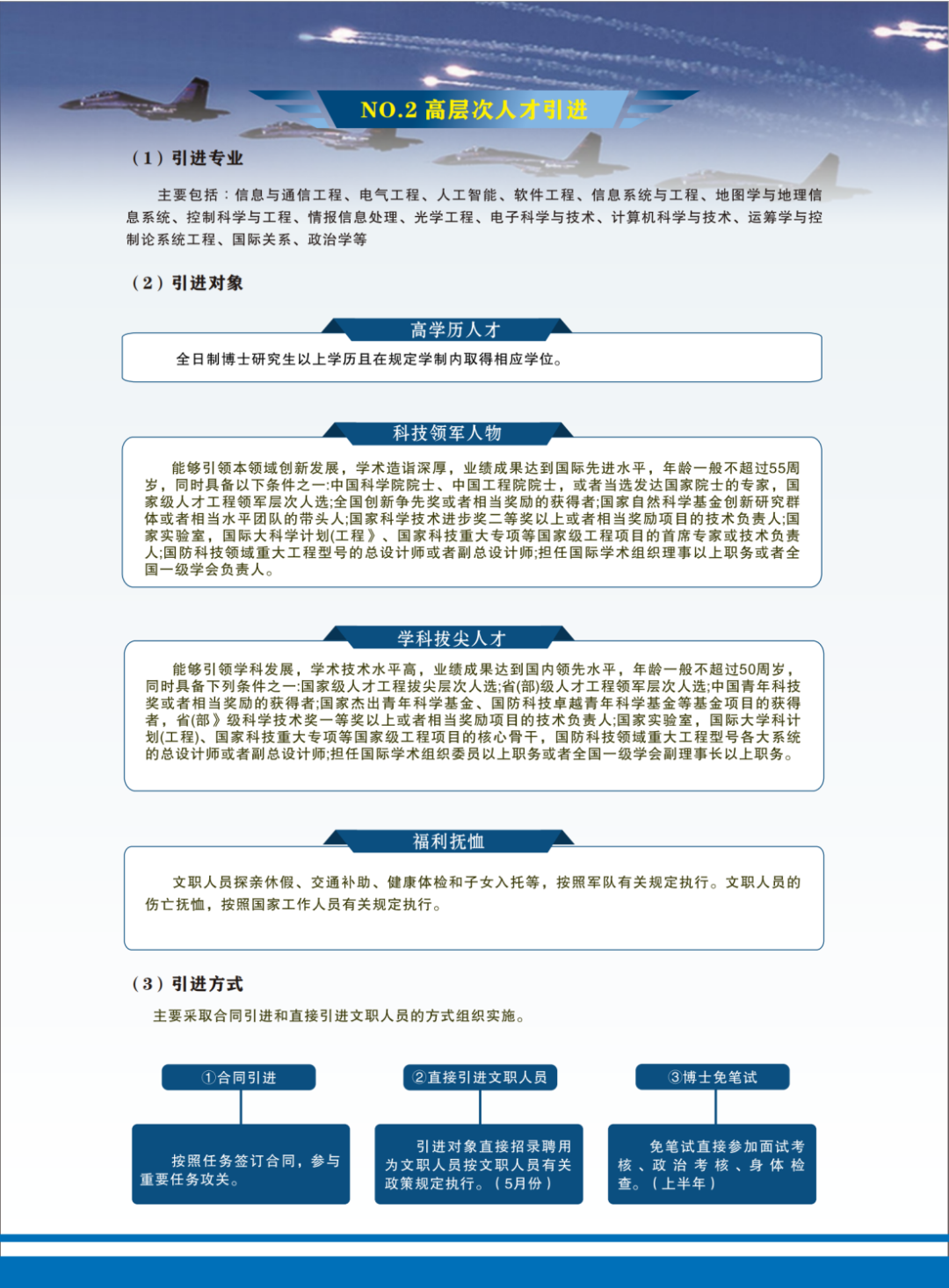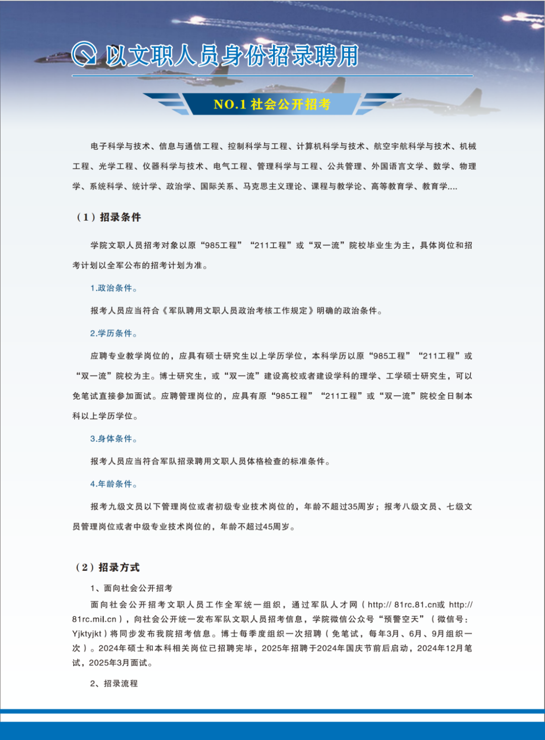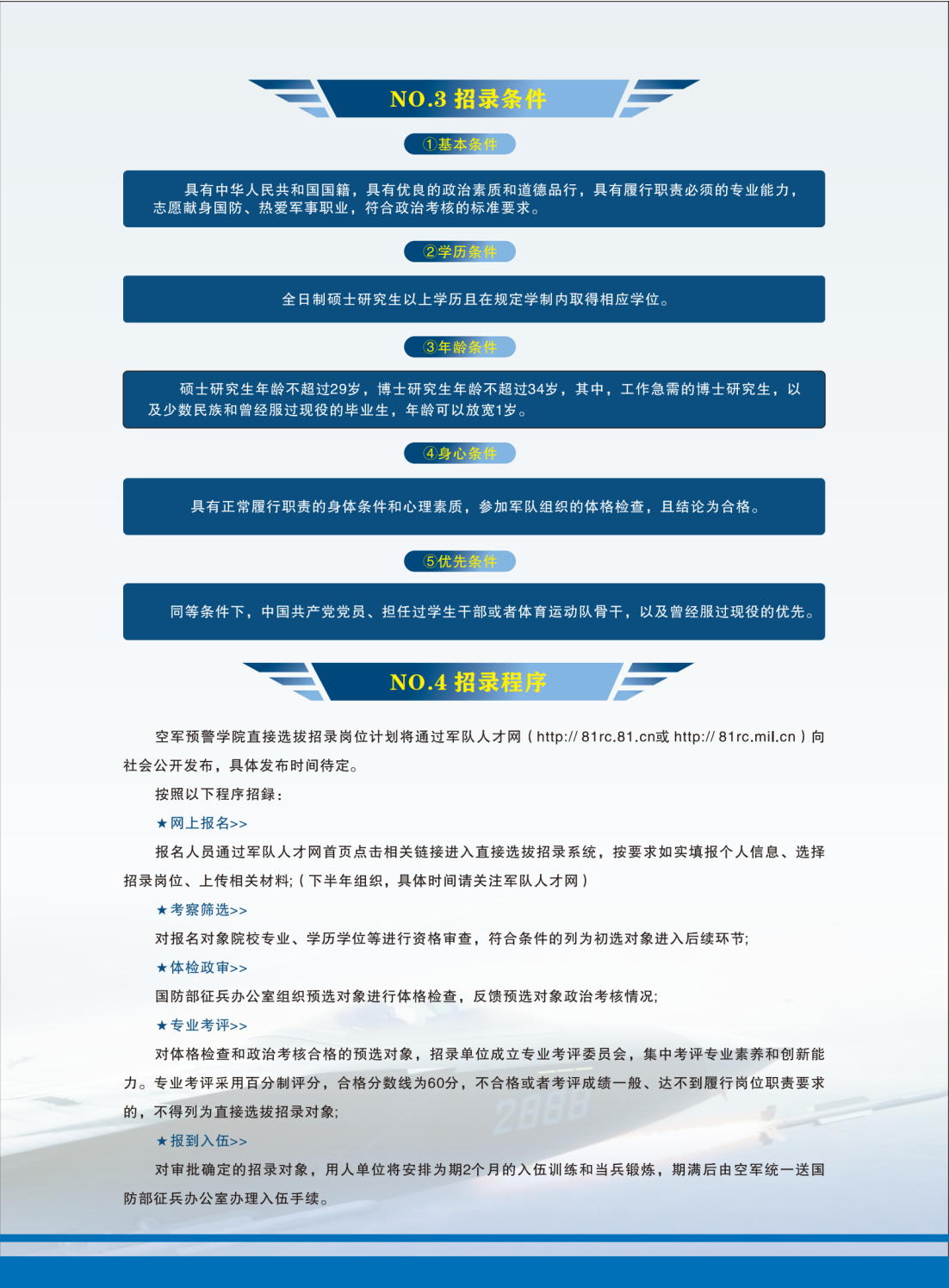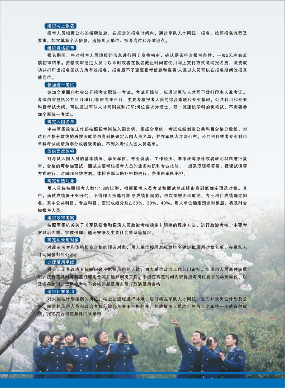 備注:2024年上半年直接選拔招錄公告擬于3月16日上午8時(shí)由軍委統(tǒng)一在軍隊(duì)人才網(wǎng)上發(fā)布。3月19日零時(shí)至3月28日24時(shí)組織網(wǎng)上報(bào)名。4月5日前確定初選對(duì)象,后由軍隊(duì)大單位統(tǒng)一將名單發(fā)國動(dòng)部組織體檢政審。歡迎廣大考生踴躍報(bào)名!