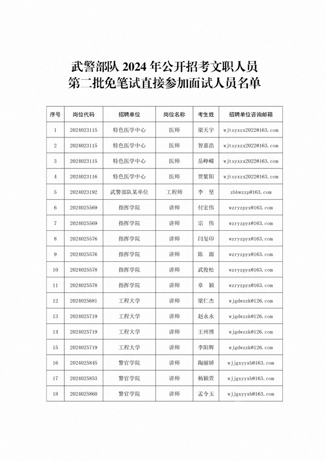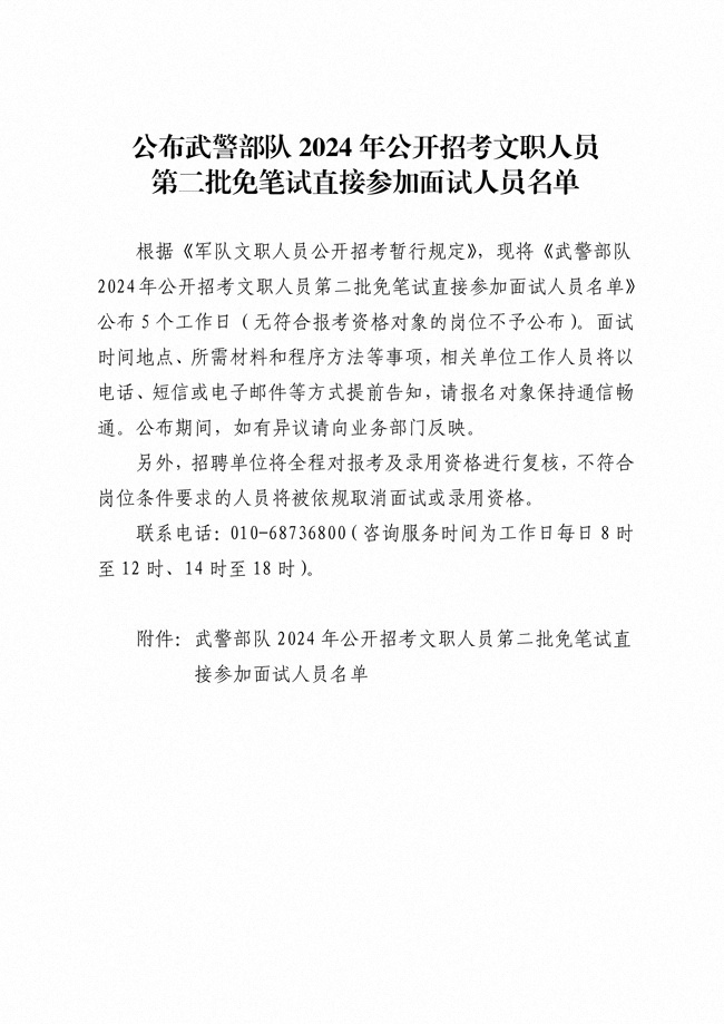 原文標(biāo)題:公布武警部隊(duì)2024年公開(kāi)招考文職人員第二批免筆試直接參加面試人員名單