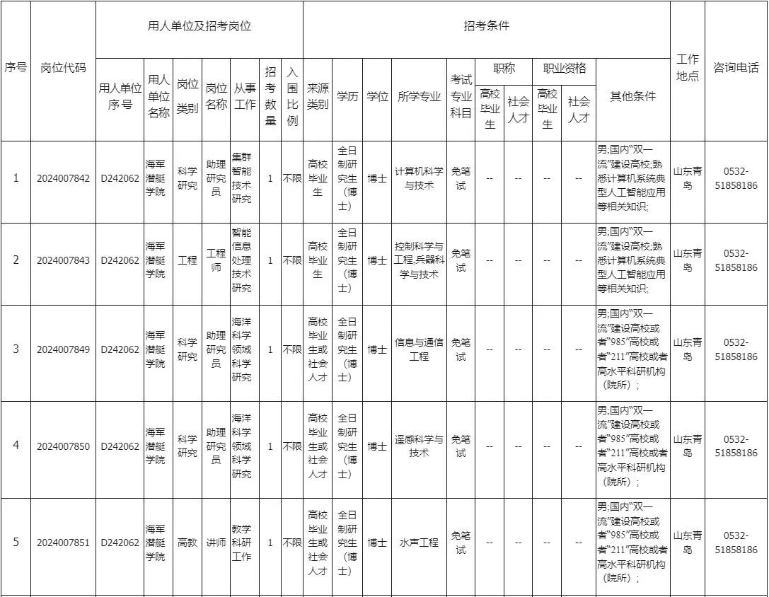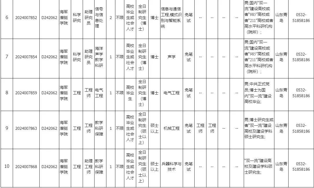 海軍潛艇學(xué)院2024年第三批面向社會(huì)公開(kāi)招考文職人員免筆試崗位計(jì)劃
