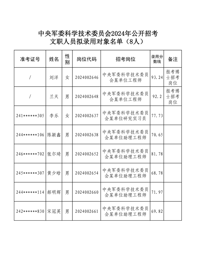 原文標題:公示中央軍委科學技術委員會2024年公開招考文職人員擬錄用對象名單
