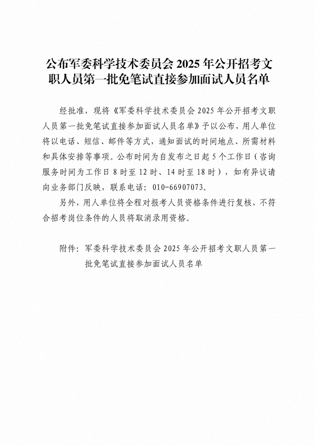原文標(biāo)題:公布軍委科學(xué)技術(shù)委員會2025年公開招考文職人員第一批免筆試直接參加面試人員名單