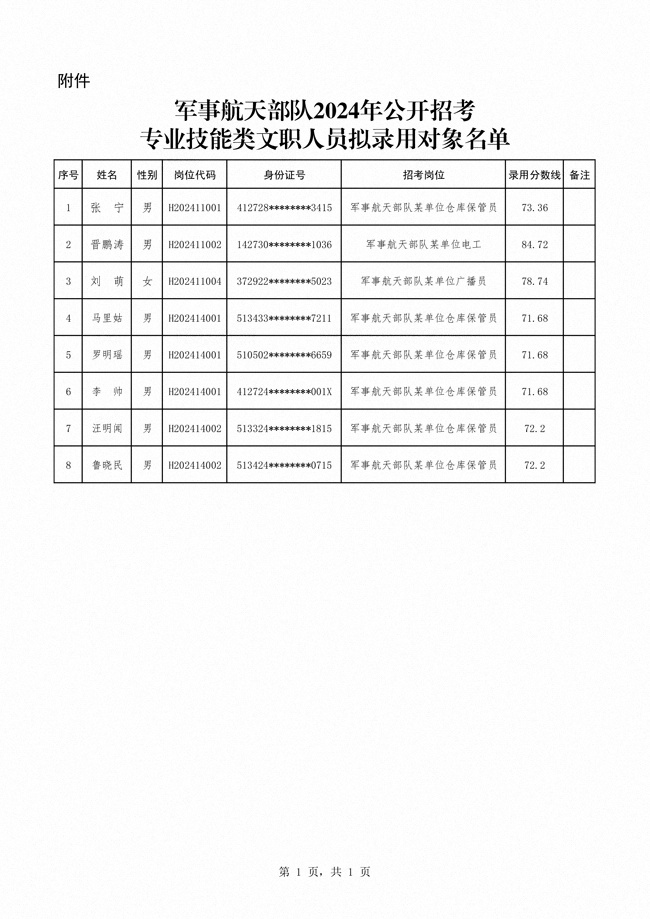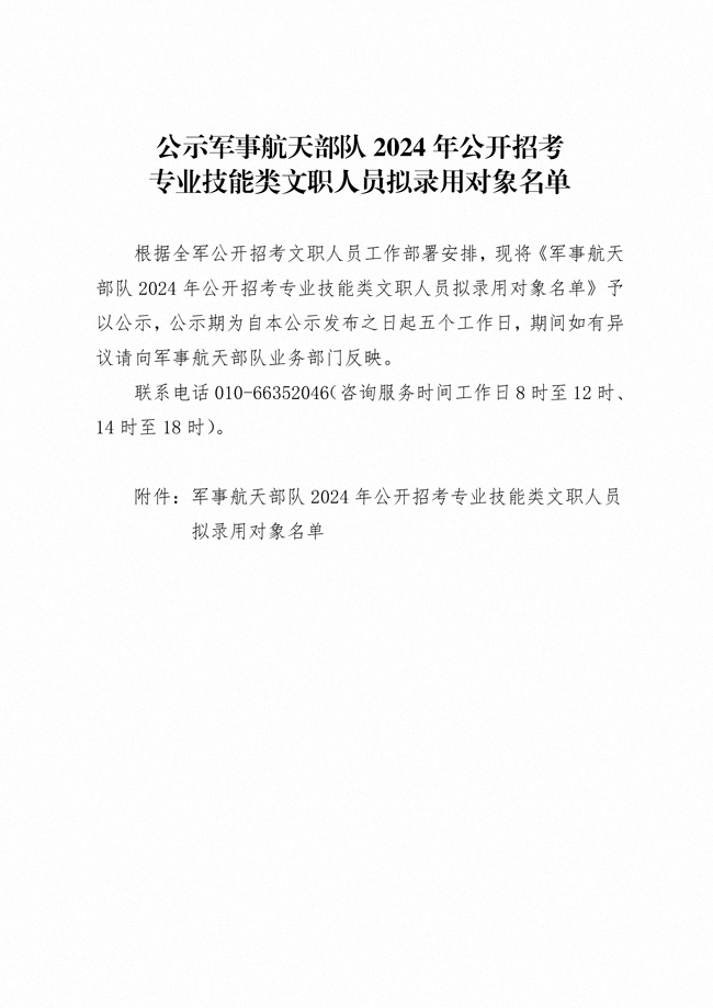 原文標(biāo)題:公示軍事航天部隊(duì)2024年公開(kāi)招考專(zhuān)業(yè)技能類(lèi)文職人員擬錄用對(duì)象名單