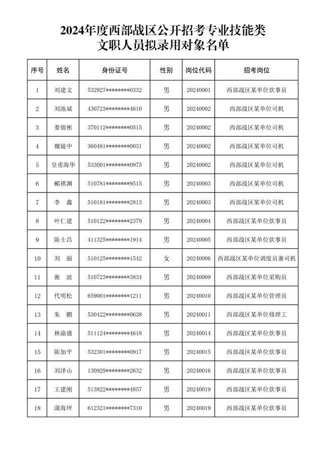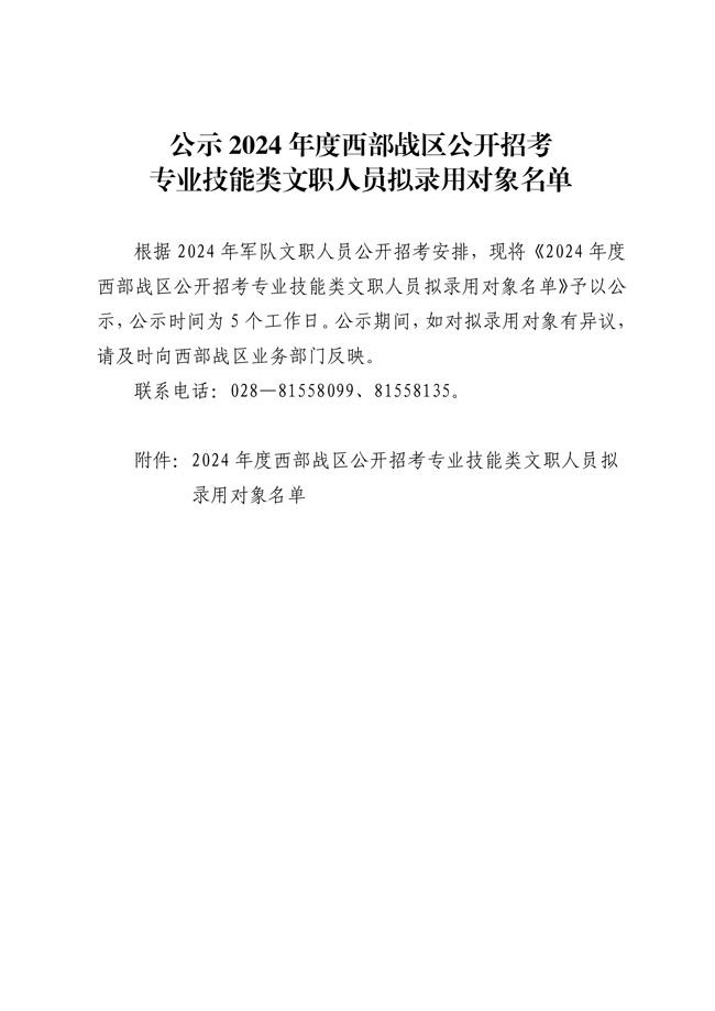 原文標(biāo)題:公示2024年度西部戰(zhàn)區(qū)公開招考專業(yè)技能類文職人員擬錄用對象名單