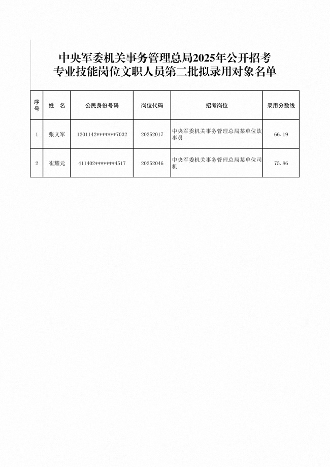 原文標(biāo)題:公示中央軍委機(jī)關(guān)事務(wù)管理總局2025年公開招考專業(yè)技能崗位文職人員第二批擬錄用對(duì)象名單
