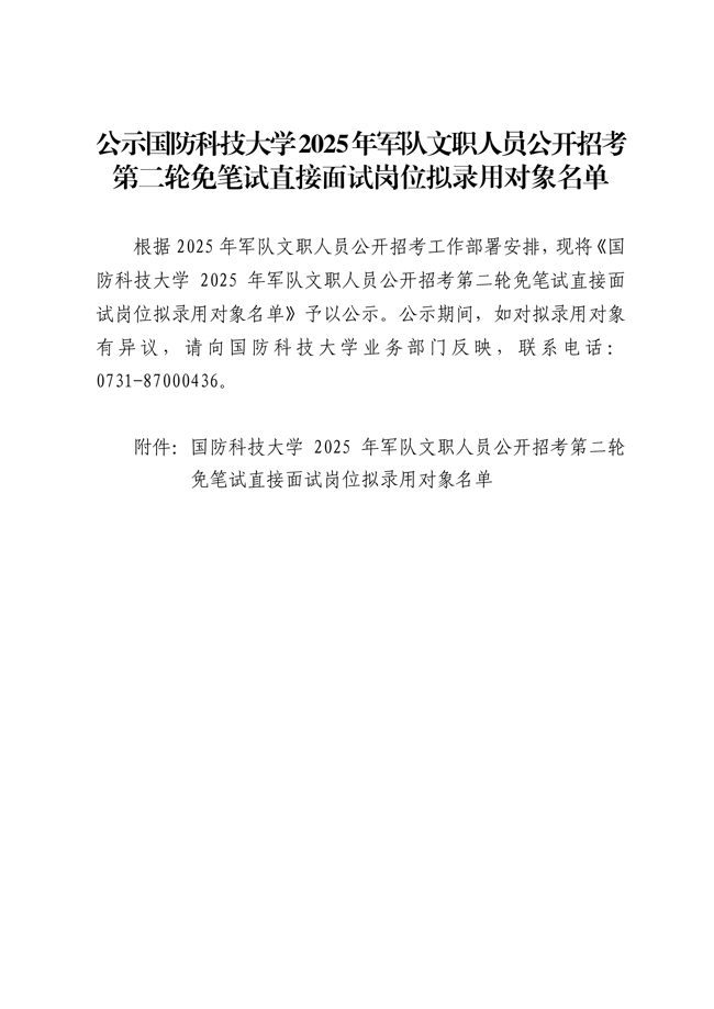 原文標(biāo)題:公示國(guó)防科技大學(xué)2025年軍隊(duì)文職人員公開招考第二輪免筆試直接面試崗位擬錄用對(duì)象名單