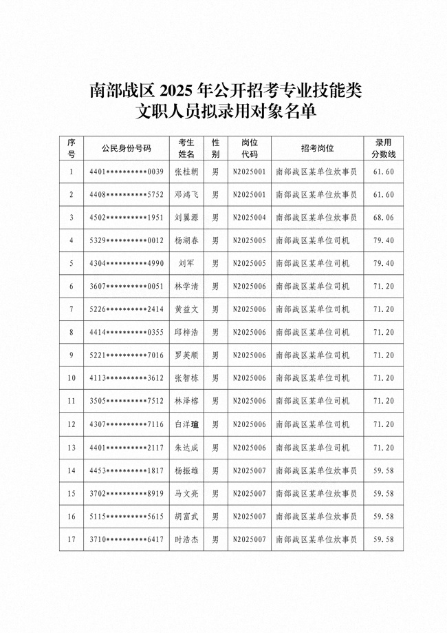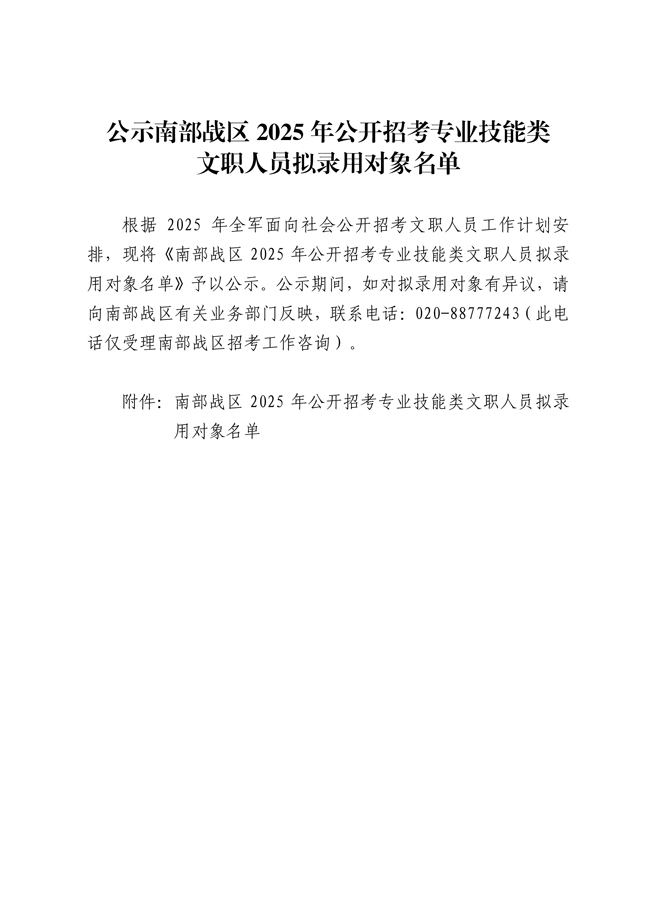 原文標(biāo)題:公示南部戰(zhàn)區(qū)2025年公開招考專業(yè)技能類文職人員擬錄用對象名單