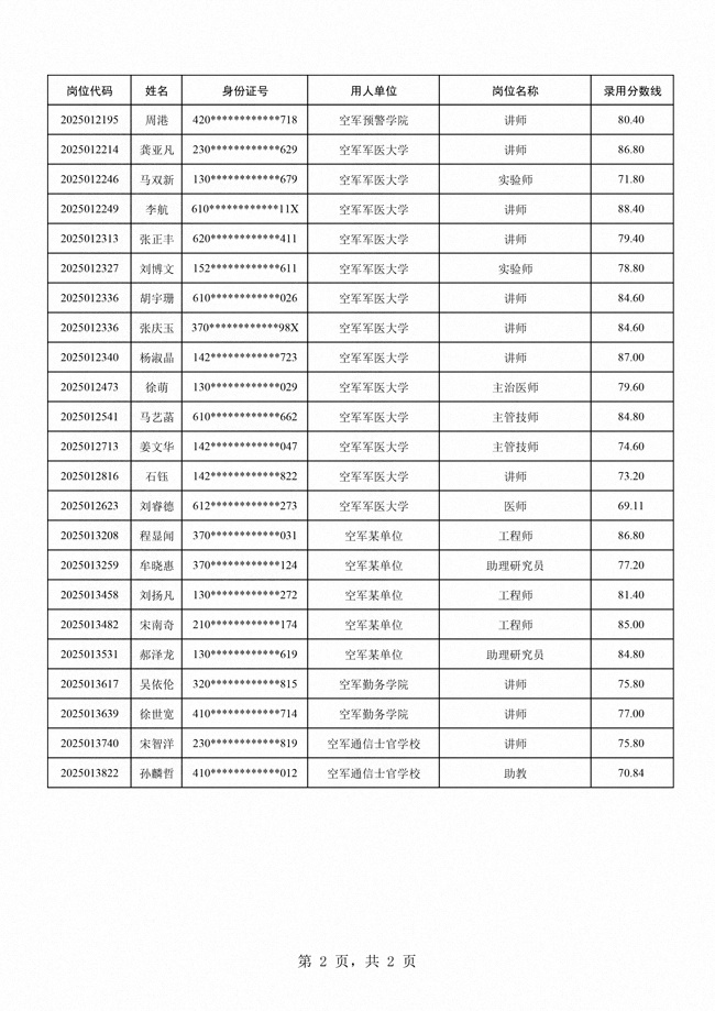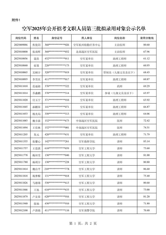 原文標題:公示2025年空軍文職人員公開招考第三批、直接引進第二批擬錄用對象名單