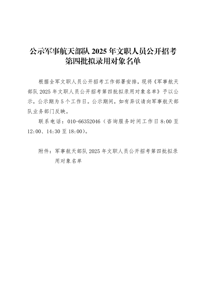 原文標(biāo)題:公示軍事航天部隊(duì)2025年文職人員公開招考第四批擬錄用對(duì)象名單