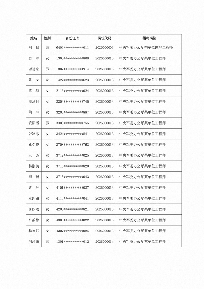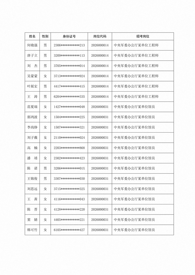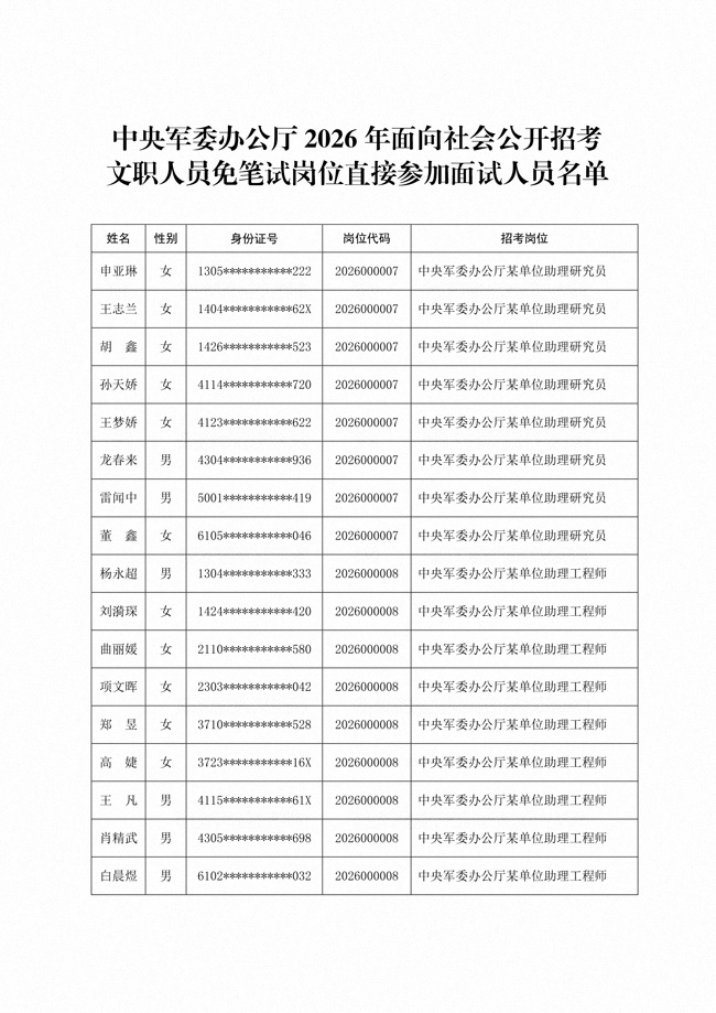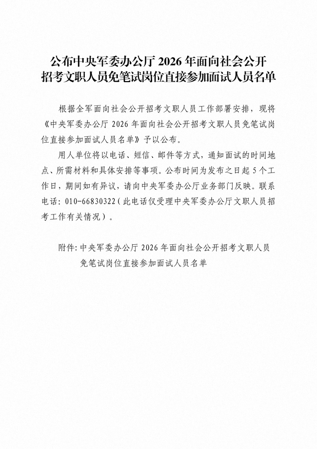 原文標(biāo)題:公布中央軍委辦公廳2026年面向社會(huì)公開招考文職人員免筆試崗位直接參加面試人員名單